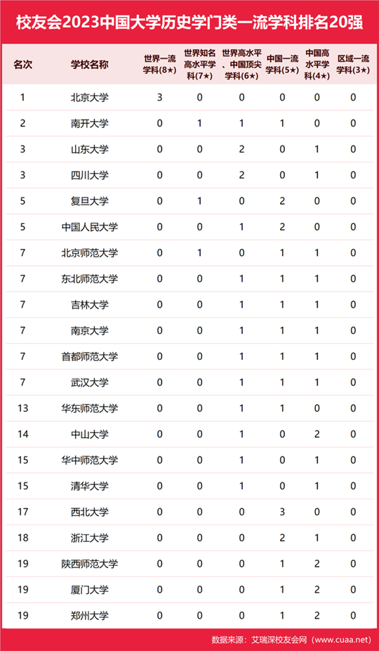 北京大學(xué)、南開大學(xué)、山東大學(xué)、四川大學(xué)、復(fù)旦大學(xué)、中國人民大學(xué)、北京師范大學(xué)、東北師范大學(xué)、吉林大學(xué)、南京大學(xué)、首都師范大學(xué)、武漢大學(xué)名列2023中國大學(xué)歷史學(xué)門類一流學(xué)科排名10強(qiáng),北京大學(xué)、北京外國語大學(xué)、復(fù)旦大學(xué)、南京大學(xué)、清華大學(xué)、浙江大學(xué)、北京師范大學(xué)、武漢大學(xué)、中國人民大學(xué)、華東師范大學(xué)、暨南大學(xué)、南京師范大學(xué)、南開大學(xué)、四川大學(xué)名列2023中國大學(xué)文學(xué)門類一流學(xué)科排名10強(qiáng)。