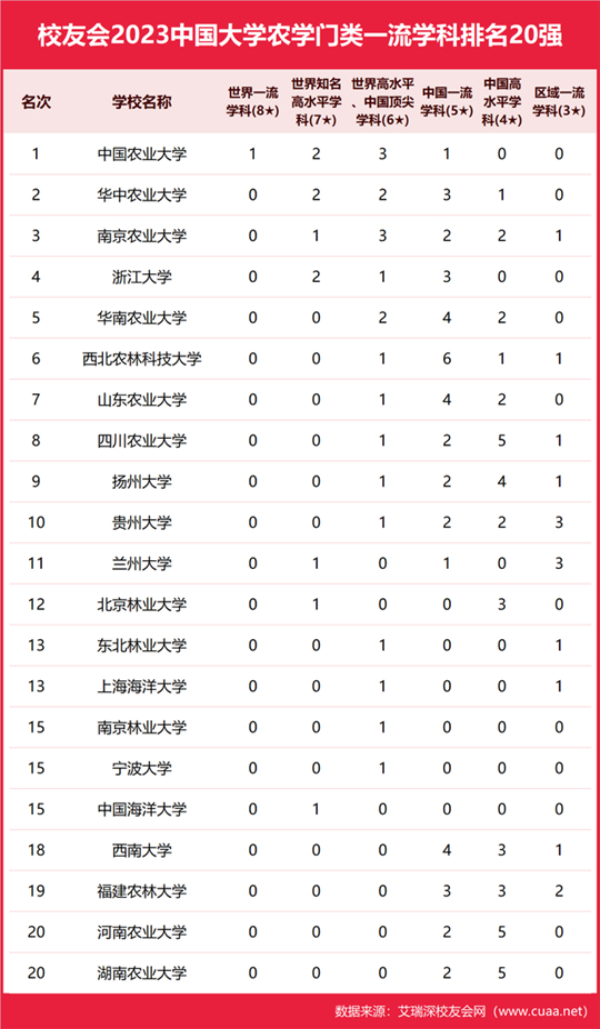 中國農(nóng)業(yè)大學(xué)、華中農(nóng)業(yè)大學(xué)、南京農(nóng)業(yè)大學(xué)、浙江大學(xué)、華南農(nóng)業(yè)大學(xué)、西北農(nóng)林科技大學(xué)、山東農(nóng)業(yè)大學(xué)、四川農(nóng)業(yè)大學(xué)、揚(yáng)州大學(xué)、貴州大學(xué)名列2023中國大學(xué)農(nóng)學(xué)門類一流學(xué)科排名10強(qiáng),北京大學(xué)、北京協(xié)和醫(yī)學(xué)院、四川大學(xué)、上海交通大學(xué)、北京中醫(yī)藥大學(xué)、浙江大學(xué)、南京中醫(yī)藥大學(xué)、復(fù)旦大學(xué)、華中科技大學(xué)、中山大學(xué)名列2023中國大學(xué)醫(yī)學(xué)門類一流學(xué)科排名10強(qiáng)。