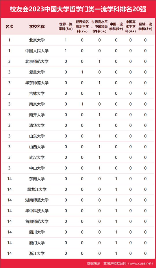 清華大學(xué)、中央美術(shù)學(xué)院、中國美術(shù)學(xué)院、北京師范大學(xué)、中國傳媒大學(xué)、北京電影學(xué)院、中國戲曲學(xué)院、福建師范大學(xué)、上海戲劇學(xué)院、上海音樂學(xué)院名列2023中國大學(xué)藝術(shù)學(xué)門類一流學(xué)科排名10強(qiáng),北京大學(xué)、中國人民大學(xué)、北京師范大學(xué)、復(fù)旦大學(xué)、華東師范大學(xué)、吉林大學(xué)、南京大學(xué)、南開大學(xué)、清華大學(xué)、山東大學(xué)、山西大學(xué)、武漢大學(xué)、中山大學(xué)名列2023中國大學(xué)哲學(xué)門類一流學(xué)科排名10強(qiáng)。