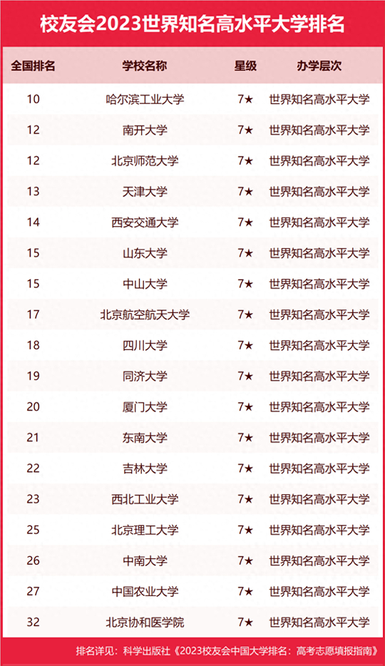 | 校友會(huì)2023世界知名高水平大學(xué)排名,哈爾濱工業(yè)大學(xué)第一,南開大學(xué)前二 |