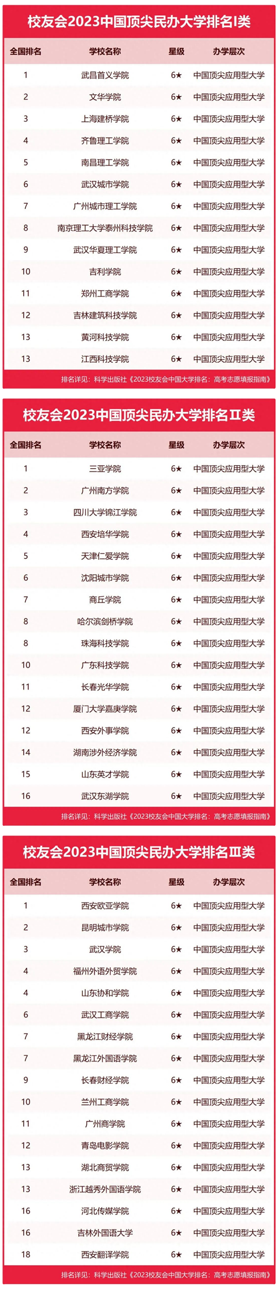 在最新2023中國大學(xué)星級(jí)排名中,中國六星級(jí)民辦大學(xué)(6★)是中國頂尖應(yīng)用型大學(xué),是中國綜合辦學(xué)實(shí)力最強(qiáng)和辦學(xué)水平最高的民辦大學(xué)。
