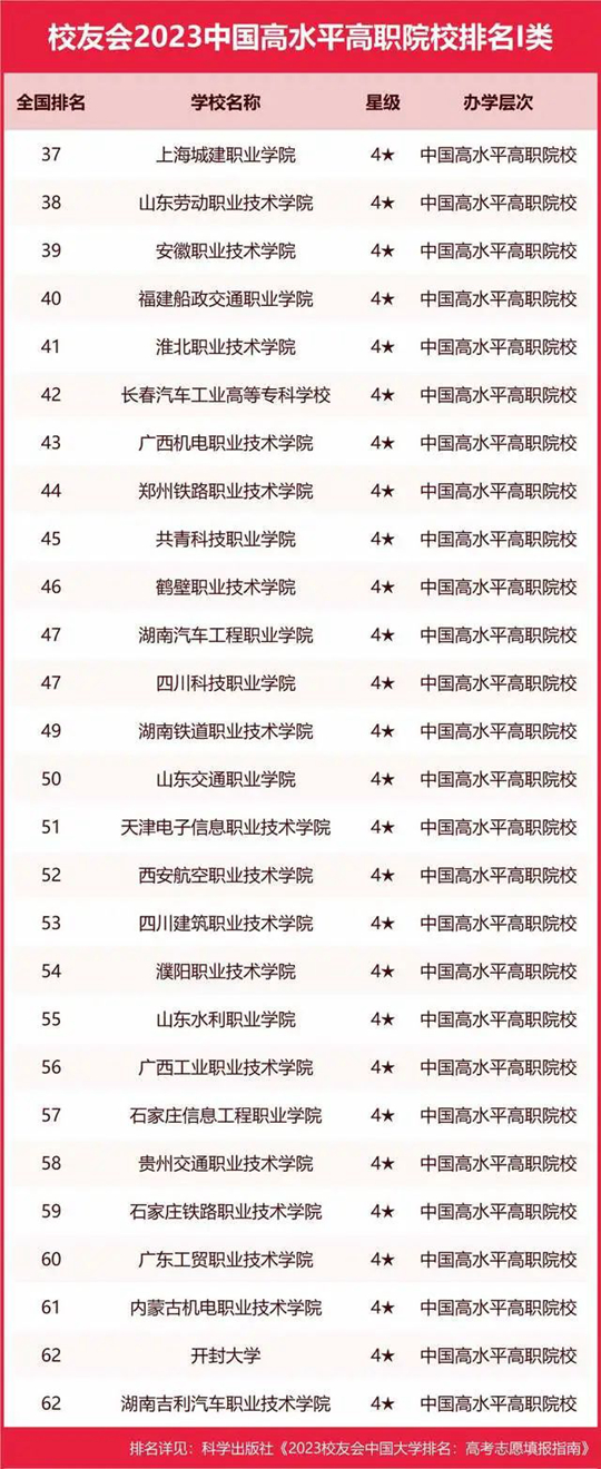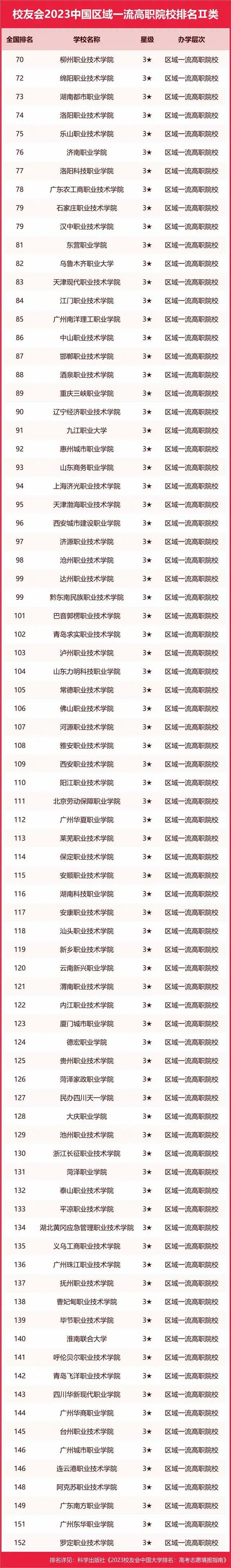 校友會中國高職院校星級排名依據(jù)中國高職院校綜合實力和辦學(xué)水平將民辦高校分為6個星級,即:6★(中國頂尖高職院校)、5★(中國一流高職院校)、4★(中國高水平高職院校)、3★(中國區(qū)域一流高職院校)、2★(中國區(qū)域高水平高職院校)和1★(中國區(qū)域知名高職院校)。