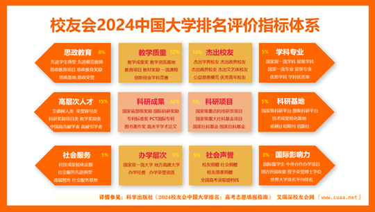 校友會2024中國大學(xué)排名評價指標(biāo)體系由辦學(xué)層次、思政教育、教學(xué)質(zhì)量、杰出校友、高層次人才、學(xué)科專業(yè)、科研項目、科研基地、科研成果、社會服務(wù)、社會聲譽和國際影響力等12大一級指標(biāo)組成,圍繞著“大平臺、大團隊、大項目、大成果、大校友”體系框架展開系統(tǒng)評價,涵蓋的評價指標(biāo)高達900多項。