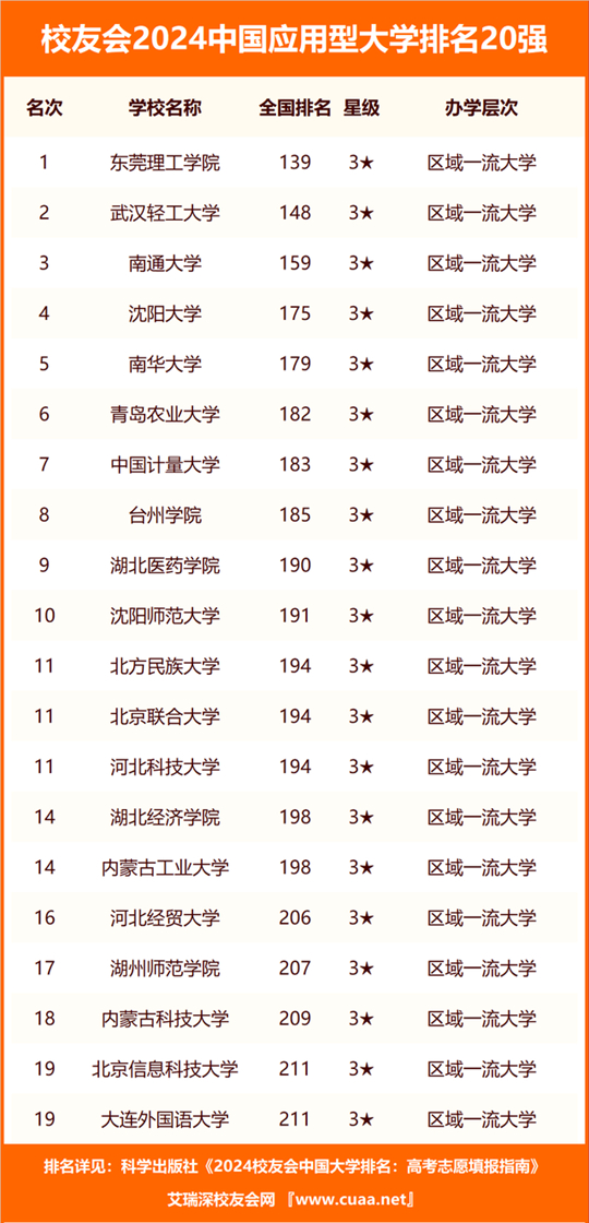 其中,東莞理工學(xué)院、武漢輕工大學(xué)、南通大學(xué)、沈陽大學(xué)、南華大學(xué)、青島農(nóng)業(yè)大學(xué)、中國計量大學(xué)、臺州學(xué)院、湖北醫(yī)藥學(xué)院、沈陽師范大學(xué)雄居校友會2024中國應(yīng)用型大學(xué)排名前10強。