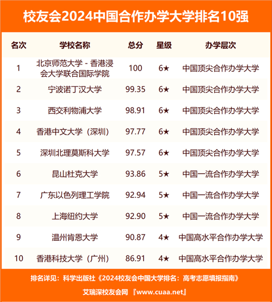 北京師范大學(xué)-香港浸會大學(xué)聯(lián)合國際學(xué)院、寧波諾丁漢大學(xué)、西交利物浦大學(xué)、香港中文大學(xué)(深圳)、深圳北理莫斯科大學(xué)、昆山杜克大學(xué)、廣東以色列理工學(xué)院、上海紐約大學(xué)、溫州肯恩大學(xué)、香港科技大學(xué)(廣州)雄居校友會2024中國合作辦學(xué)大學(xué)排名前10強。