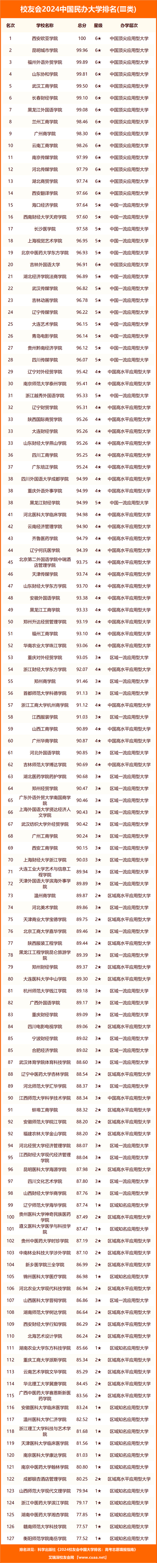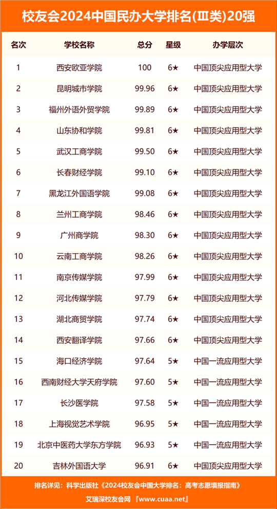 西安歐亞學(xué)院、昆明城市學(xué)院、福州外語外貿(mào)學(xué)院、山東協(xié)和學(xué)院、武漢工商學(xué)院、長春財經(jīng)學(xué)院、黑龍江外國語學(xué)院、蘭州工商學(xué)院、廣州商學(xué)院、云南工商學(xué)院位列2024中國民辦大學(xué)排名Ⅲ類前10名。