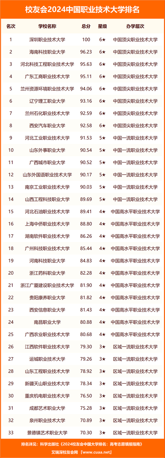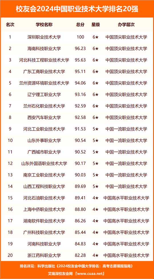深圳信息職業(yè)技術(shù)學(xué)院、武漢職業(yè)技術(shù)學(xué)院、浙江金融職業(yè)學(xué)院雄居校友會2024中國高職院校排名第一。深圳職業(yè)技術(shù)大學(xué)、海南科技職業(yè)大學(xué)、河北科技工程職業(yè)技術(shù)大學(xué)位居校友會2024中國職業(yè)技術(shù)大學(xué)排名前3甲。