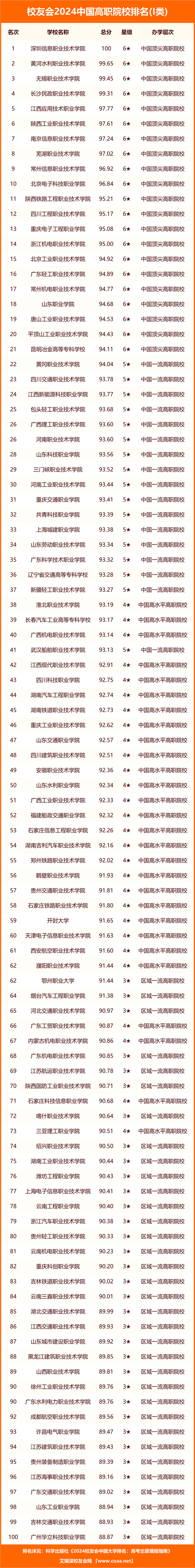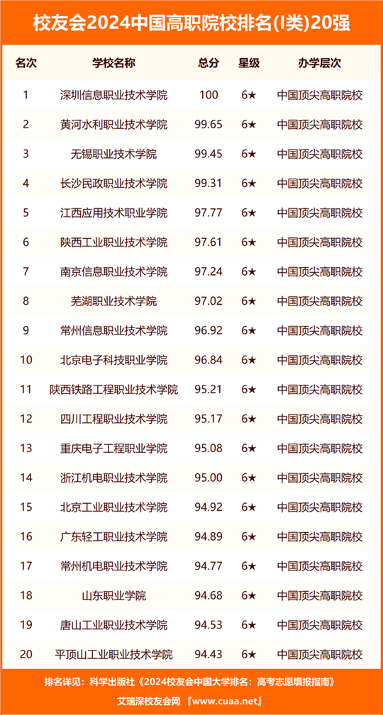 在校友會2024中國高職院校排名中,深圳信息職業(yè)技術(shù)學(xué)院、黃河水利職業(yè)技術(shù)學(xué)院、無錫職業(yè)技術(shù)學(xué)院、長沙民政職業(yè)技術(shù)學(xué)院、江西應(yīng)用技術(shù)職業(yè)學(xué)院、陜西工業(yè)職業(yè)技術(shù)學(xué)院、南京信息職業(yè)技術(shù)學(xué)院、蕪湖職業(yè)技術(shù)學(xué)院、常州信息職業(yè)技術(shù)學(xué)院、北京電子科技職業(yè)學(xué)院雄居2024中國高職院校排名I類前10強