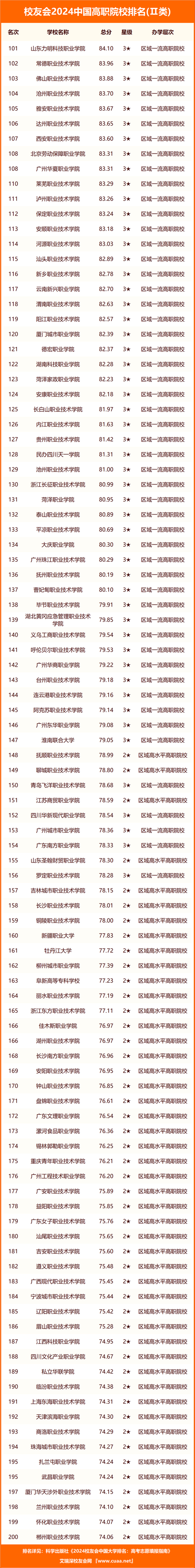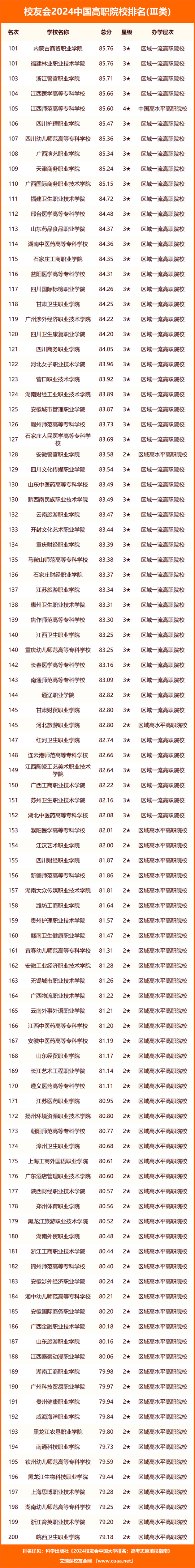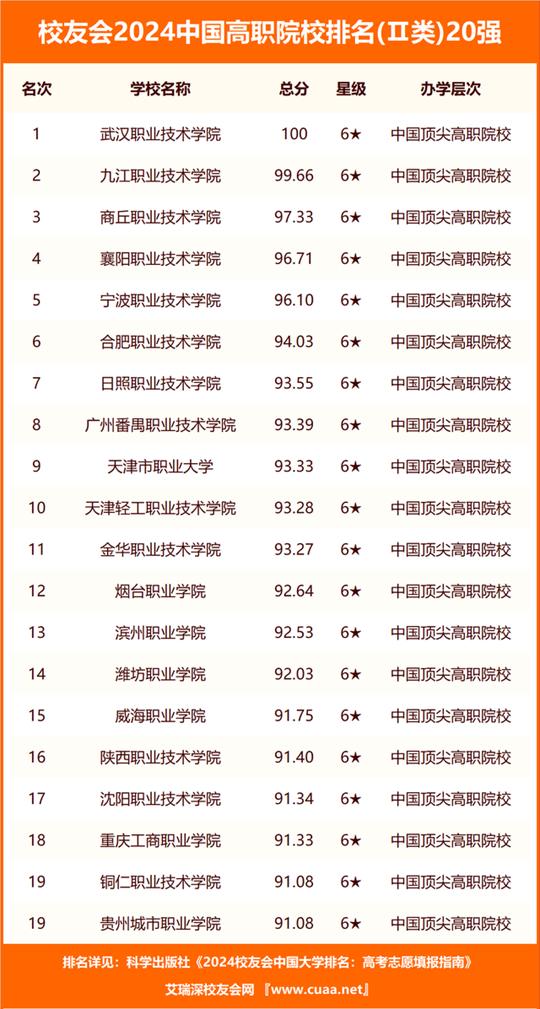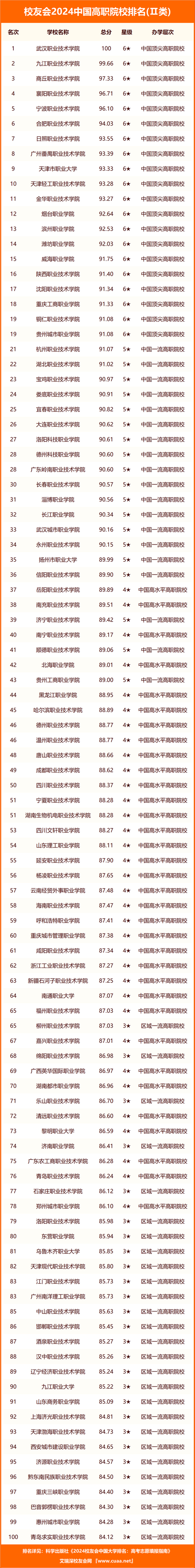 武漢職業(yè)技術(shù)學(xué)院、九江職業(yè)技術(shù)學(xué)院、商丘職業(yè)技術(shù)學(xué)院、襄陽職業(yè)技術(shù)學(xué)院、寧波職業(yè)技術(shù)學(xué)院、合肥職業(yè)技術(shù)學(xué)院、日照職業(yè)技術(shù)學(xué)院、廣州番禺職業(yè)技術(shù)學(xué)院、天津市職業(yè)大學(xué)、天津輕工職業(yè)技術(shù)學(xué)院位列2024中國高職院校排名Ⅱ類前10強;