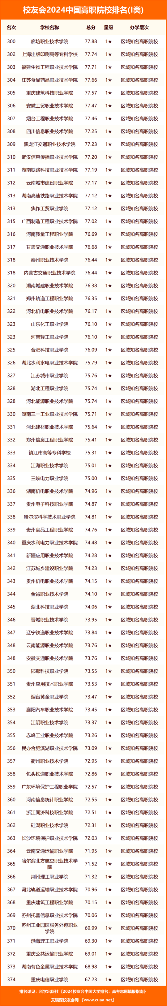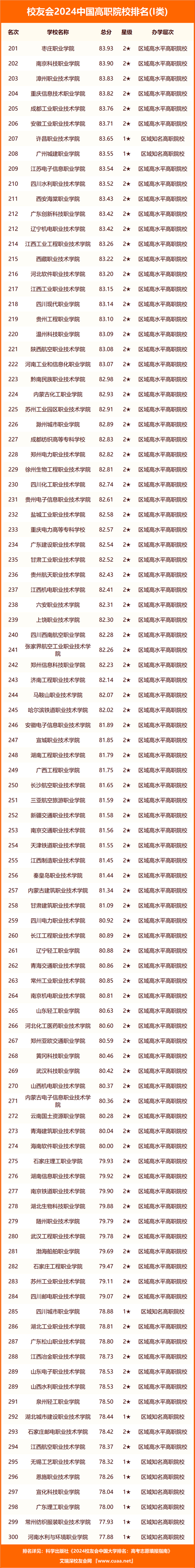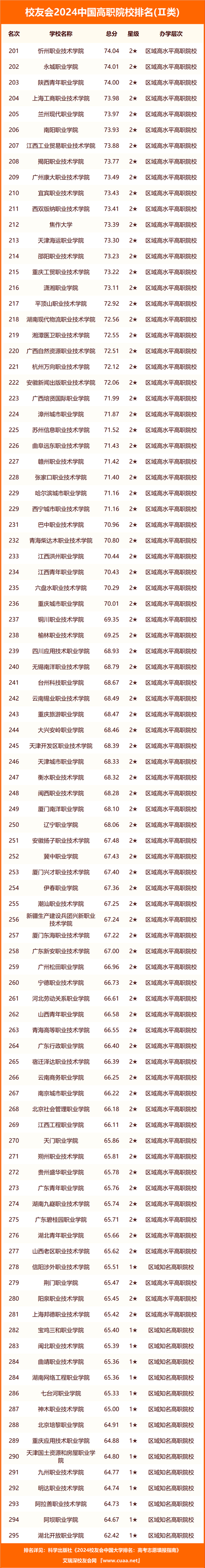 武漢職業(yè)技術(shù)學(xué)院、九江職業(yè)技術(shù)學(xué)院、商丘職業(yè)技術(shù)學(xué)院、襄陽職業(yè)技術(shù)學(xué)院、寧波職業(yè)技術(shù)學(xué)院、合肥職業(yè)技術(shù)學(xué)院、日照職業(yè)技術(shù)學(xué)院、廣州番禺職業(yè)技術(shù)學(xué)院、天津市職業(yè)大學(xué)、天津輕工職業(yè)技術(shù)學(xué)院位列2024中國高職院校排名Ⅱ類前10強;