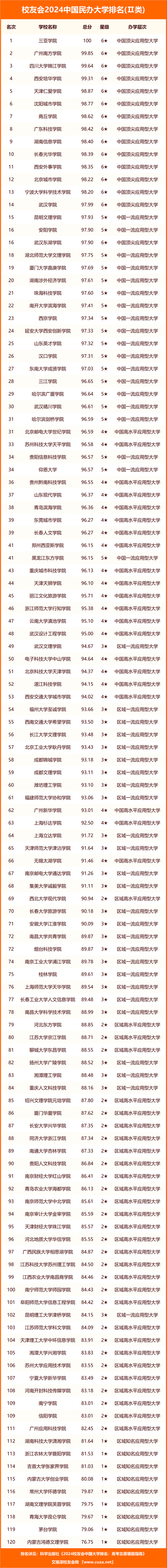 三亞學(xué)院、廣州南方學(xué)院、四川大學(xué)錦江學(xué)院、西安培華學(xué)院、天津仁愛學(xué)院、沈陽城市學(xué)院、商丘學(xué)院、廣東科技學(xué)院、湖南信息學(xué)院、長春光華學(xué)院位列2024中國民辦大學(xué)排名Ⅱ類前10強。