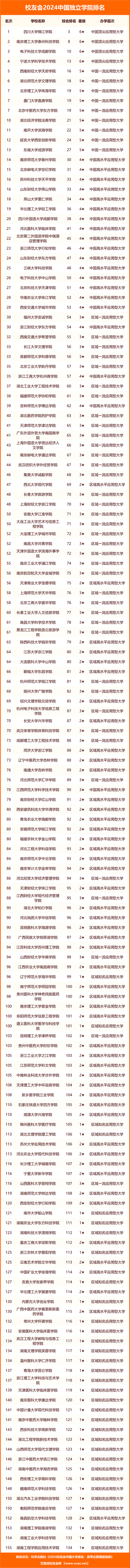 四川大學(xué)錦江學(xué)院、南京理工大學(xué)泰州科技學(xué)院、電子科技大學(xué)成都學(xué)院、寧波大學(xué)科學(xué)技術(shù)學(xué)院、西南財經(jīng)大學(xué)天府學(xué)院、湖北師范大學(xué)文理學(xué)院、北京理工大學(xué)珠海學(xué)院、廈門大學(xué)嘉庚學(xué)院、北京中醫(yī)藥大學(xué)東方學(xué)院、湖北經(jīng)濟學(xué)院法商學(xué)院名列校友會2024中國獨立學(xué)院排名前10強。
