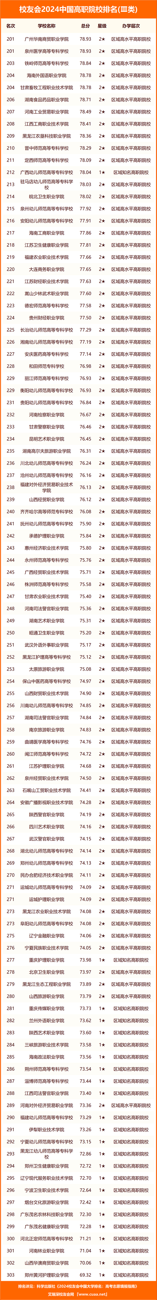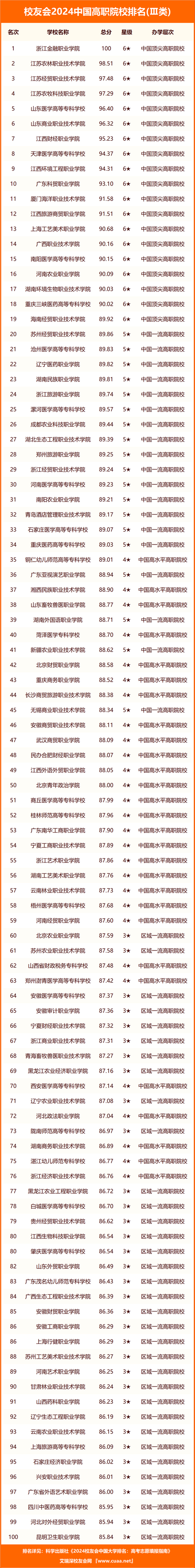 浙江金融職業(yè)學(xué)院、江蘇農(nóng)林職業(yè)技術(shù)學(xué)院、江蘇經(jīng)貿(mào)職業(yè)技術(shù)學(xué)院、江蘇農(nóng)牧科技職業(yè)學(xué)院、山東醫(yī)學(xué)高等?茖W(xué)校、山東商業(yè)職業(yè)技術(shù)學(xué)院、江西財經(jīng)職業(yè)學(xué)院、天津醫(yī)學(xué)高等?茖W(xué)校、江西環(huán)境工程職業(yè)學(xué)院、廣東科貿(mào)職業(yè)學(xué)院名列2024中國高職院校排名Ⅲ類前10名。
