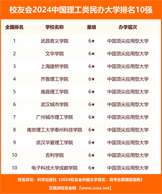 在2024中國(guó)理工類民辦大學(xué)排名中,武昌首義學(xué)院、文華學(xué)院、上海建橋?qū)W院、齊魯理工學(xué)院、南昌理工學(xué)院位居前5強(qiáng)。