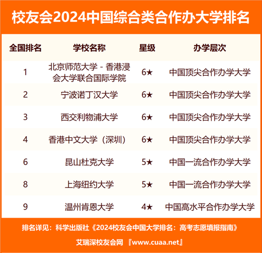 北京師范大學-香港浸會大學聯(lián)合國際學院、寧波諾丁漢大學、西交利物浦大學、香港中文大學(深圳)、昆山杜克大學位居校友會2024中國綜合類合作辦學大學排名5強。