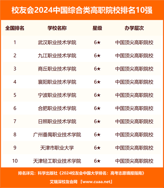 武漢職業(yè)技術學院、九江職業(yè)技術學院、商丘職業(yè)技術學院、襄陽職業(yè)技術學院、寧波職業(yè)技術學院位居校友會2024中國綜合類高職院校排名5強。
