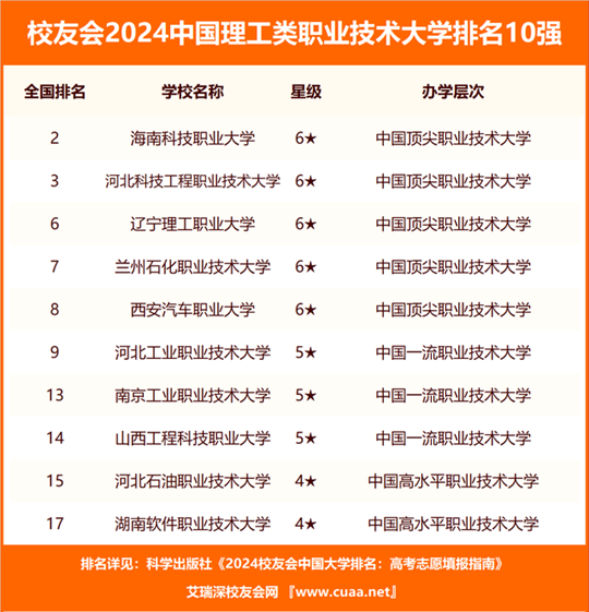 海南科技職業(yè)大學、河北科技工程職業(yè)技術大學、遼寧理工職業(yè)大學、蘭州石化職業(yè)技術大學、西安汽車職業(yè)大學位居校友會2024中國理工類職業(yè)技術大學排名5強。