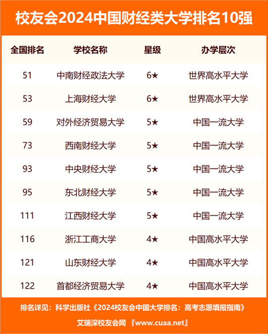 中南財經(jīng)政法大學、上海財經(jīng)大學、對外經(jīng)濟貿(mào)易大學、西南財經(jīng)大學、中央財經(jīng)大學位居校友會2024中國財經(jīng)類大學排名5強。