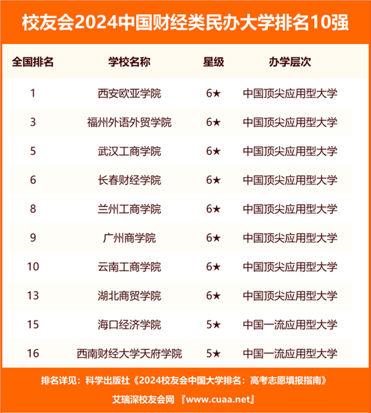 西安歐亞學院、福州外語外貿(mào)學院、武漢工商學院、長春財經(jīng)學院、蘭州工商學院位居校友會2024中國財經(jīng)類民辦大學排名5強。