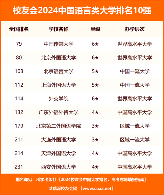中國傳媒大學、北京外國語大學、北京語言大學、上海外國語大學、外交學院位居校友會2024中國語言類大學排名5強。