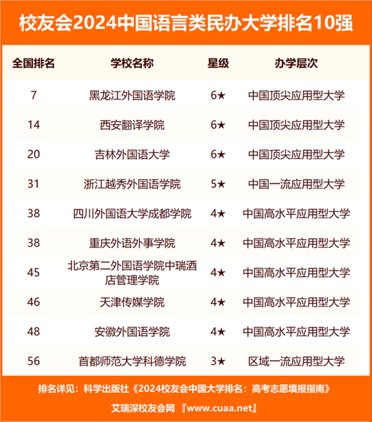 黑龍江外國語學院、西安翻譯學院、吉林外國語大學、浙江越秀外國語學院、四川外國語大學成都學院、重慶外語外事學院位居校友會2024中國語言類民辦大學排名5強。
