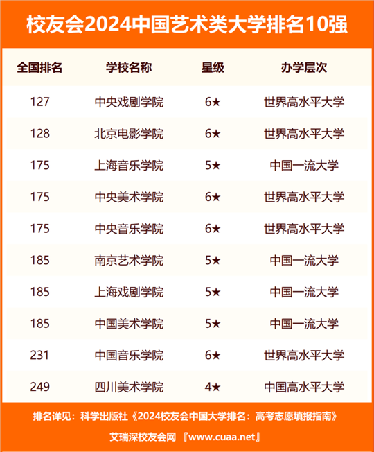 中央戲劇學院、北京電影學院、上海音樂學院、中央美術學院、中央音樂學院位居校友會2024中國藝術類大學排名5強。