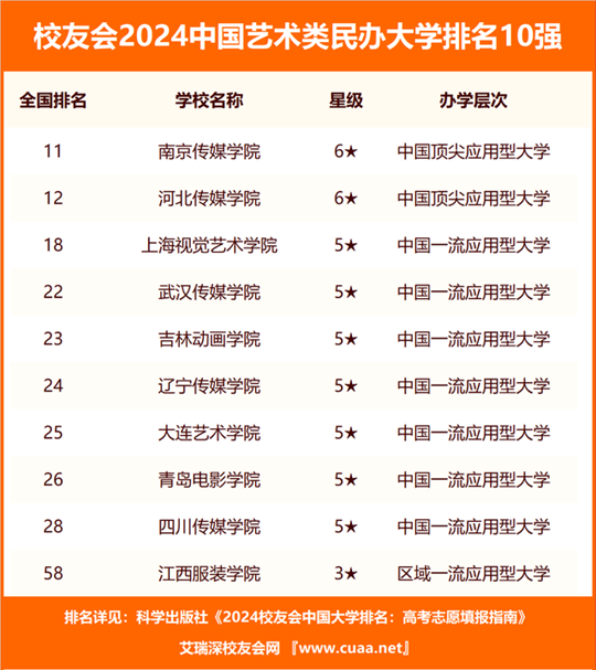 南京傳媒學院、河北傳媒學院、上海視覺藝術學院、武漢傳媒學院、吉林動畫學院位居校友會2024中國藝術類民辦大學排名5強。