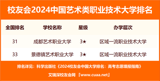 成都藝術職業(yè)大學、景德鎮(zhèn)藝術職業(yè)大學位居校友會2024中國藝術類職業(yè)技術大學排名冠亞軍。
