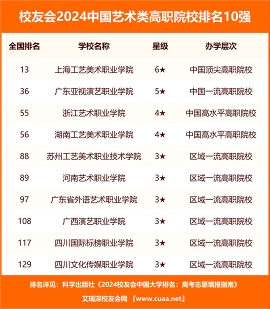 上海工藝美術職業(yè)學院、廣東亞視演藝職業(yè)學院、浙江藝術職業(yè)學院、湖南工藝美術職業(yè)學院、蘇州工藝美術職業(yè)技術學院位居校友會2024中國藝術類高職院校排名5強。