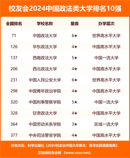 中國政法大學、華東政法大學、西南政法大學、西北政法大學、中國人民公安大學位居校友會2024中國政法類大學排名5強。
