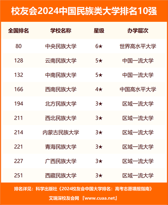 中央民族大學、云南民族大學、中南民族大學、西南民族大學、北方民族大學位居校友會2024中國民族類大學排名5強。