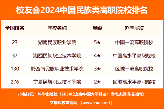 湖南民族職業(yè)學院、湘西民族職業(yè)技術學院、黔西南民族職業(yè)技術學院、寧夏民族職業(yè)技術學院位居校友會2024中國民族類高職院校排名5強。