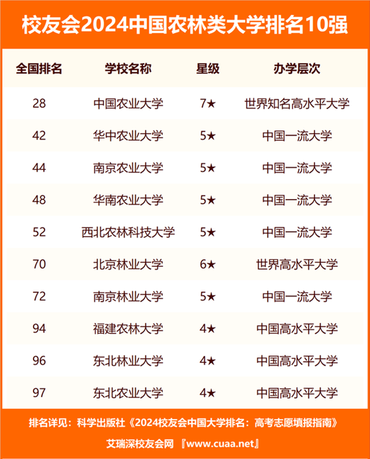 中國農(nóng)業(yè)大學、華中農(nóng)業(yè)大學、南京農(nóng)業(yè)大學、華南農(nóng)業(yè)大學、西北農(nóng)林科技大學位居校友會2024中國農(nóng)林類大學排名。華南農(nóng)業(yè)大學珠江學院、福建農(nóng)林大學金山學院、中南林業(yè)科技大學涉外學院、河北農(nóng)業(yè)大學現(xiàn)代科技學院、湖南農(nóng)業(yè)大學東方科技學院位居校友會2024中國農(nóng)林類民辦大學排名5強。