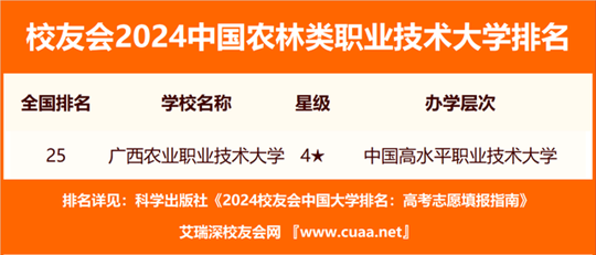 廣西農(nóng)業(yè)職業(yè)技術大學位居校友會2024中國農(nóng)林類職業(yè)技術大學排名第1。