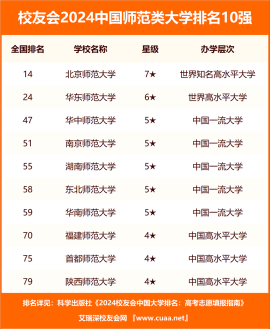 北京師范大學、華東師范大學、華中師范大學、南京師范大學、湖南師范大學位居校友會2024中國師范類大學排名5強。