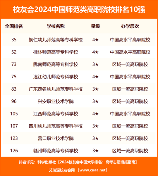 銅仁幼兒師范高等專科學校、桂林師范高等?茖W校、隴南師范高等專科學校、湛江幼兒師范專科學校、廣東茂名幼兒師范?茖W校位居校友會2024中國師范類高職院校排名5強。