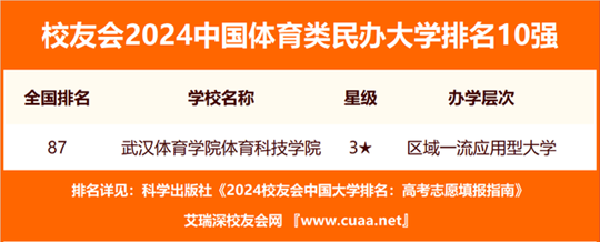 武漢體育學院體育科技學院位居校友會2024中國體育類民辦大學排名第1。