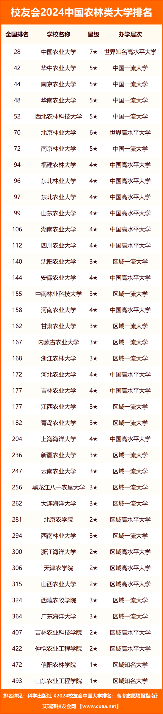 為給2024年全國高考考生選擇填報(bào)中國農(nóng)林類高校提供參考,2024年1月16日,全國第三方大學(xué)評(píng)價(jià)機(jī)構(gòu)艾瑞深校友會(huì)網(wǎng)(Cuaa.net)正式公布《2024校友會(huì)中國大學(xué)排名:高考志愿填報(bào)指南》,發(fā)布最新校友會(huì)2024中國農(nóng)林類大學(xué)排名,該書將由科學(xué)出版社公開出版發(fā)行。