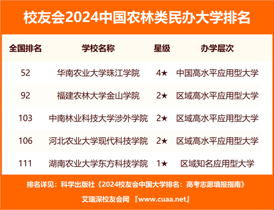 在最新校友會(huì)2024中國農(nóng)林類民辦大學(xué)排名中,華南農(nóng)業(yè)大學(xué)珠江學(xué)院(全國第52名)第1,福建農(nóng)林大學(xué)金山學(xué)院(全國第92名)第2,中南林業(yè)科技大學(xué)涉外學(xué)院(全國第103名)第3,河北農(nóng)業(yè)大學(xué)現(xiàn)代科技學(xué)院(全國第106名)第4,湖南農(nóng)業(yè)大學(xué)東方科技學(xué)院(全國第111名)第5。