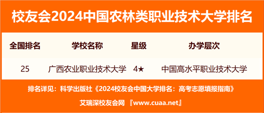 在最新校友會(huì)2024中國農(nóng)林類職業(yè)技術(shù)大學(xué)排名中,廣西農(nóng)業(yè)職業(yè)技術(shù)大學(xué)(全國第25名)第1。
