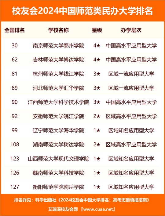 南京師范大學(xué)泰州學(xué)院雄居2024中國師范類民辦大學(xué)排名第一,杭州師范大學(xué)錢江學(xué)院前三