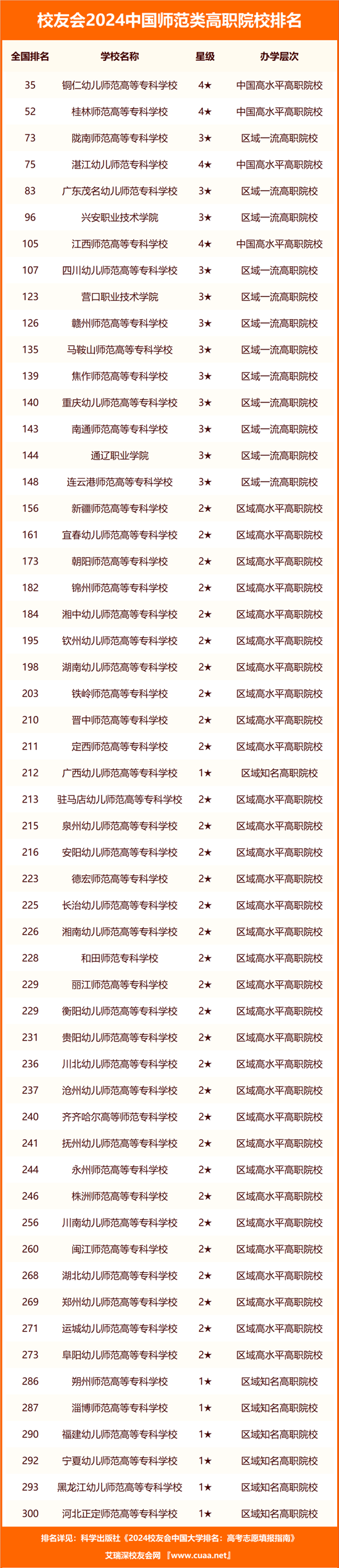 在最新校友會2024中國師范類高職院校排名中,銅仁幼兒師范高等專科學(xué)校(全國第35名)第1,桂林師范高等?茖W(xué)校(全國第52名)第2,隴南師范高等專科學(xué)校(全國第73名)第3,湛江幼兒師范專科學(xué)校(全國第75名)第4,廣東茂名幼兒師范專科學(xué)校(全國第83名)第5,興安職業(yè)技術(shù)學(xué)院(全國第96名)第6,江西師范高等?茖W(xué)校(全國第105名)第7,四川幼兒師范高等?茖W(xué)校(全國第107名)第8,營口職業(yè)技術(shù)學(xué)院(全國第123名)第9,贛州師范高等?茖W(xué)校(全國第126名)第10。