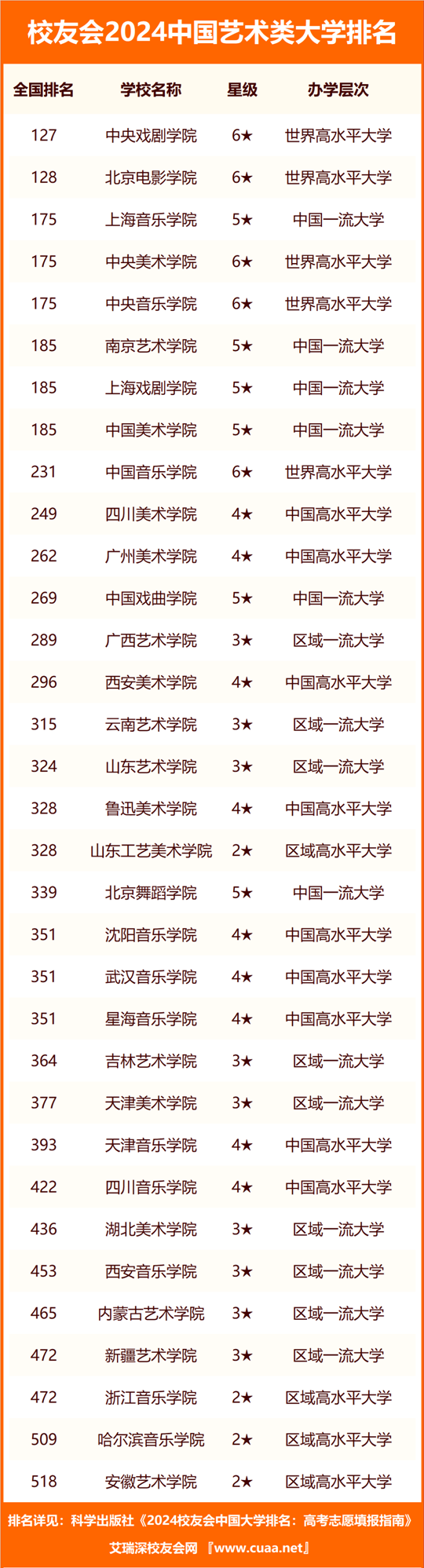 在最新校友會(huì)2024中國藝術(shù)類大學(xué)排名中,中央戲劇學(xué)院(全國第127名)第1,北京電影學(xué)院(全國第128名)第2,上海音樂學(xué)院(全國第175名)第3,中央美術(shù)學(xué)院(全國第175名)第3,中央音樂學(xué)院(全國第175名)第3,南京藝術(shù)學(xué)院(全國第185名)第6,上海戲劇學(xué)院(全國第185名)第6,中國美術(shù)學(xué)院(全國第185名)第6,中國音樂學(xué)院(全國第231名)第9,四川美術(shù)學(xué)院(全國第249名)第10。