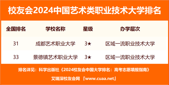 在最新校友會(huì)2024中國藝術(shù)類職業(yè)技術(shù)大學(xué)排名中,成都藝術(shù)職業(yè)大學(xué)(全國第31名)第1,景德鎮(zhèn)藝術(shù)職業(yè)大學(xué)(全國第33名)第2。