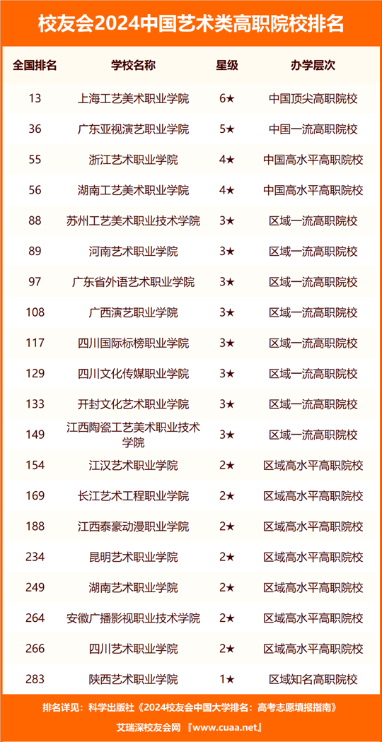 在最新校友會(huì)2024中國藝術(shù)類高職院校排名中,上海工藝美術(shù)職業(yè)學(xué)院(全國第13名)第1,廣東亞視演藝職業(yè)學(xué)院(全國第36名)第2,浙江藝術(shù)職業(yè)學(xué)院(全國第55名)第3,湖南工藝美術(shù)職業(yè)學(xué)院(全國第56名)第4,蘇州工藝美術(shù)職業(yè)技術(shù)學(xué)院(全國第88名)第5,河南藝術(shù)職業(yè)學(xué)院(全國第89名)第6,廣東省外語藝術(shù)職業(yè)學(xué)院(全國第97名)第7,廣西演藝職業(yè)學(xué)院(全國第108名)第8,四川國際標(biāo)榜職業(yè)學(xué)院(全國第117名)第9,四川文化傳媒職業(yè)學(xué)院(全國第129名)第10。