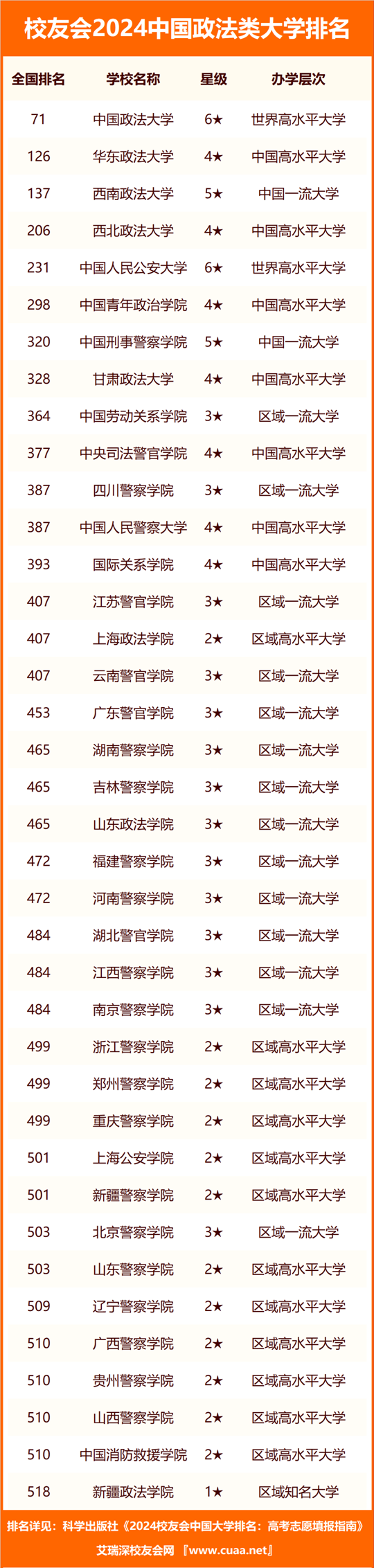 在最新校友會(huì)2024中國(guó)政法類大學(xué)排名中,中國(guó)政法大學(xué)(全國(guó)第71名)第1,華東政法大學(xué)(全國(guó)第126名)第2,西南政法大學(xué)(全國(guó)第137名)第3,西北政法大學(xué)(全國(guó)第206名)第4,中國(guó)人民公安大學(xué)(全國(guó)第231名)第5,中國(guó)青年政治學(xué)院(全國(guó)第298名)第6,中國(guó)刑事警察學(xué)院(全國(guó)第320名)第7,甘肅政法大學(xué)(全國(guó)第328名)第8,中國(guó)勞動(dòng)關(guān)系學(xué)院(全國(guó)第364名)第9,中央司法警官學(xué)院(全國(guó)第377名)第10。