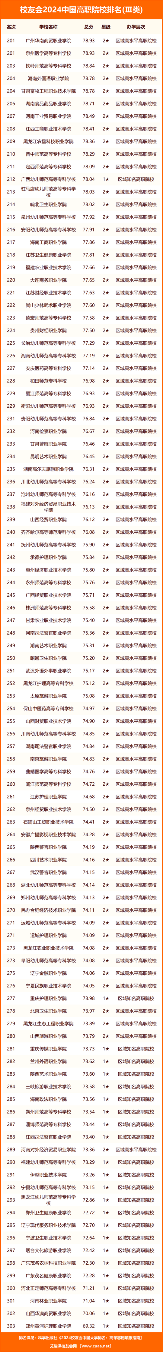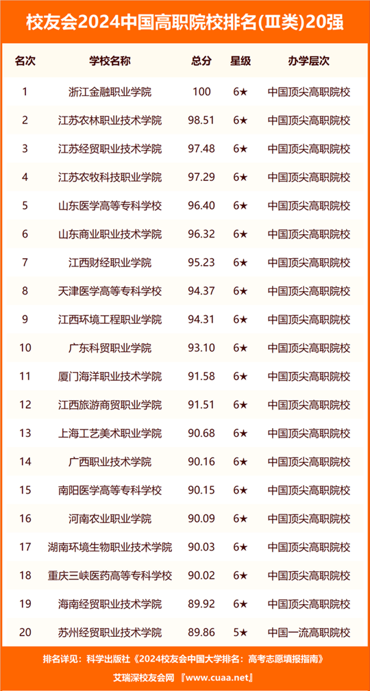 浙江金融職業(yè)學院、江蘇農(nóng)林職業(yè)技術學院、江蘇經(jīng)貿(mào)職業(yè)技術學院、江蘇農(nóng)牧科技職業(yè)學院、山東醫(yī)學高等?茖W校、山東商業(yè)職業(yè)技術學院、江西財經(jīng)職業(yè)學院、天津醫(yī)學高等專科學校、江西環(huán)境工程職業(yè)學院、廣東科貿(mào)職業(yè)學院名列校友會2024中國高職院校排名Ⅲ類前10名。