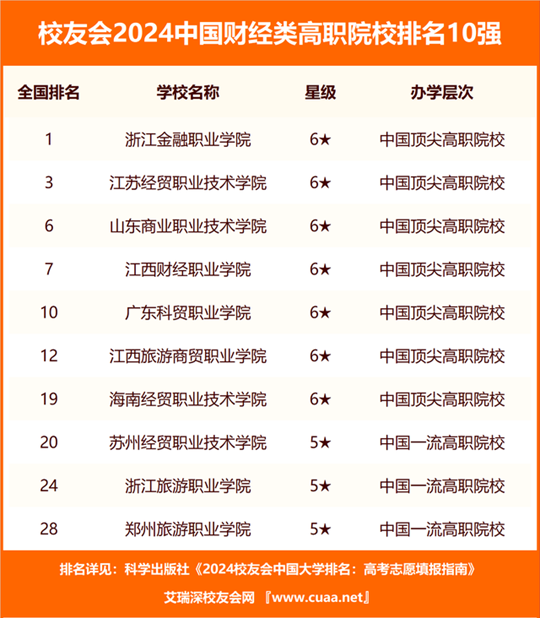 浙江金融職業(yè)學院、江蘇經(jīng)貿(mào)職業(yè)技術學院、山東商業(yè)職業(yè)技術學院、江西財經(jīng)職業(yè)學院、廣東科貿(mào)職業(yè)學院位居校友會2024中國財經(jīng)類高職院校排名5強。