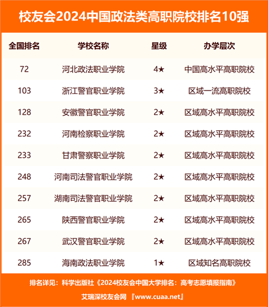 河北政法職業(yè)學院、浙江警官職業(yè)學院、安徽警官職業(yè)學院、河南檢察職業(yè)學院、甘肅警察職業(yè)學院位居校友會2024中國政法類高職院校排名5強。