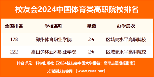鄭州體育職業(yè)學院、嵩山少林武術職業(yè)學院位居校友會2024中國體育類高職院校排名第1。